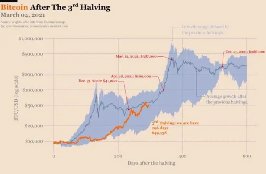 En cuanto al escenario de precios de bitcoin en función de los patrones de crecimiento que siguieron a los dos primeros halvings, ya abordado por Ecoinometrics, esta firma ofrece una actualización al 4 de marzo, reflejada en el gráfico anterior. En el momento actual, la curva de precio de BTC está nuevamente sobre la curva promedio.