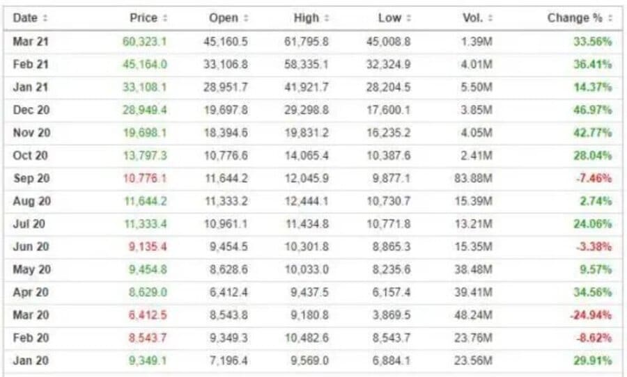 La declaración de la pandemia provocó hace exactamente un año el colapso de todos los mercados, incluido el de bitcoin y las criptomonedas. Vista en perspectiva, dicha depreciación de bitcoin se ve realmente insignificante, de acuerdo a un análisis de este viernes 12 de marzo. El punto más bajo del precio de BTC el 12 de marzo de 2020 fue de USD 3.782. Luego del máximo histórico de este sábado, bitcoin se ha apreciado 1.523% desde el jueves negro. El cuadro siguiente muestra la apreciación mensual de bitcoin desde enero de 2020.