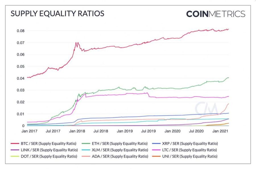 BTC y ETH tienen el mayor cociente de igualdad del suministro (SER), según Coin Metrics. Fuente: Coin Metrics.