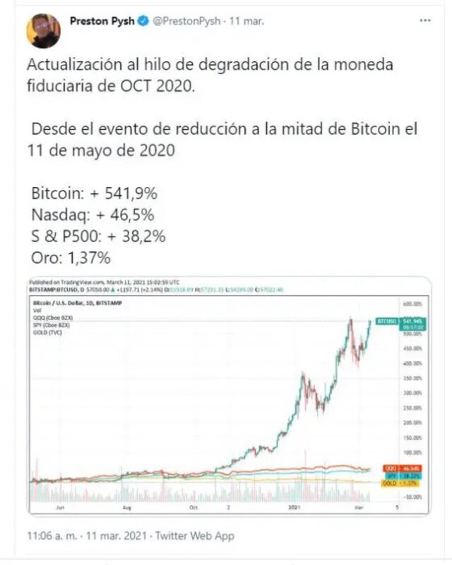 Preston Pysh, bitcoiner y podcaster, actualizó este 11 de marzo un hilo sobre la degradación de la moneda fíat y de los activos tradicionales, desde el 11 de mayo de 2020. A 10 meses de ese importante evento, el valor de bitcoin se ha sextuplicado (+541,9%), mientras que Nasdaq y S&P500 han progresado 46% y 38% respectivamente.