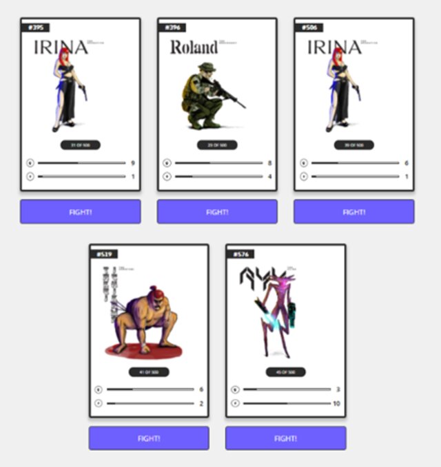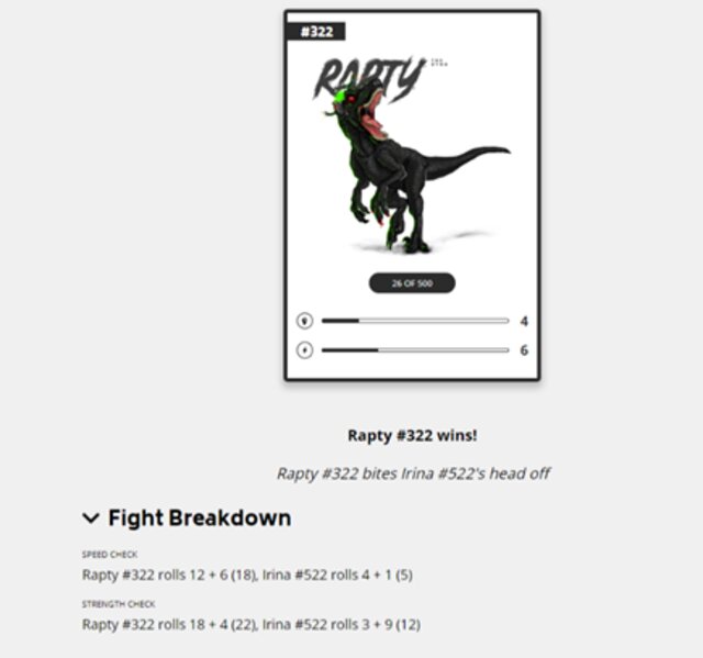 Los combates se basan en un sistema de tirada de dados D20. En el combate de arriba, Rapty sacó una buena tirada y consiguió ganar el combate, mientras que Irina perdió. Cada batalla es demostrable y ocurre en la cadena de bloques, lo que hace que cada una de tus victorias quede inmortalizada permanentemente en la cadena.
