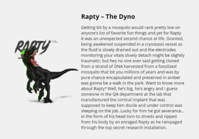 Las descripciones son también oro cómico con un lado literario. Al parecer, Rapty – The Dyno fue clonado porque le picó un mosquito que conservó el ADN en criostasis, aludiendo a los elementos de ciencia ficción de Jurassic Park. No puedes evitar reírte con la descripción del implante cortical en el que alguien bajo control dormía en el trabajo, lo que le supuso una indemnización… en forma de cabeza. Con ocurrencias como ésta, es obvio que la descripción de cada carta fue creada con cuidado. Es difícil no dejarse encantar por ellas.