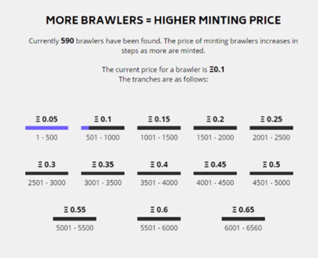 Si quieres entrar en acción, actúa cuanto antes. Las primeras que se acuñaron, que ya se han agotado, cuestan 0,05 ETH. Las que se están acuñando ahora mismo cuestan 0,1 ETH. Las siguientes que se van a acuñar cuestan 0,15 ETH y así sucesivamente. Así que si quieres hacerte con las primeras ediciones antes de que se encarezcan, cuanto antes tengas tu brawler, mejor.