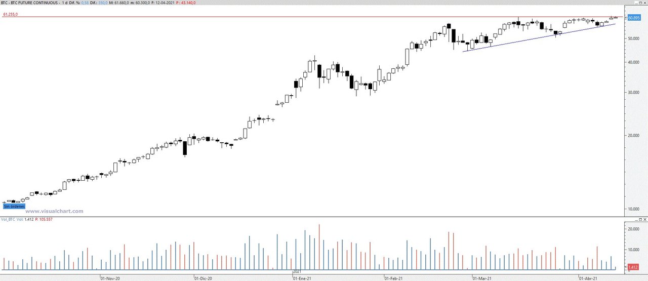 Este lunes el precio marcó un nuevo máximo históricos intradía, por la mínima, en los 61.945 dólares del futuro. Pero no así en el contado. En este último caso el máximo está en los 61.800 dólares según el exchange Coinbase, que por cierto debuta en el Nasdaq mañana.