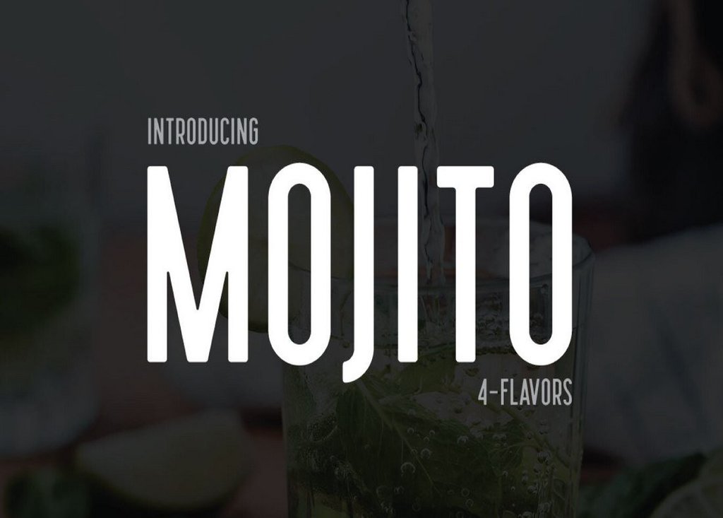 Mojito presenta un diseño de personajes muy alto y estrecho que lo hace más adecuado para diseñar títulos para carteles y encabezados de sitios web. Puedes usarlo gratis en proyectos personales.