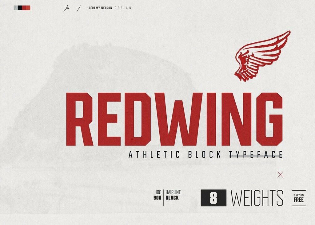 Redwing es una colección de fuentes gratuitas con un diseño de personajes grueso y en bloque. La versión gratuita de la fuente viene con 2 pesos diferentes. Ambos son de uso gratuito para proyectos personales y comerciales.