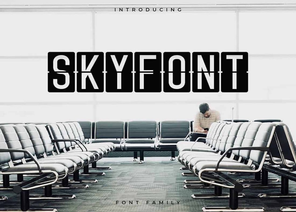 Skyfont presenta un diseño que hará que tu texto se vea como el tablero de visualización de información de vuelo en los aeropuertos. La fuente es ideal para diseñar encabezados y títulos creativos para sitios web.
