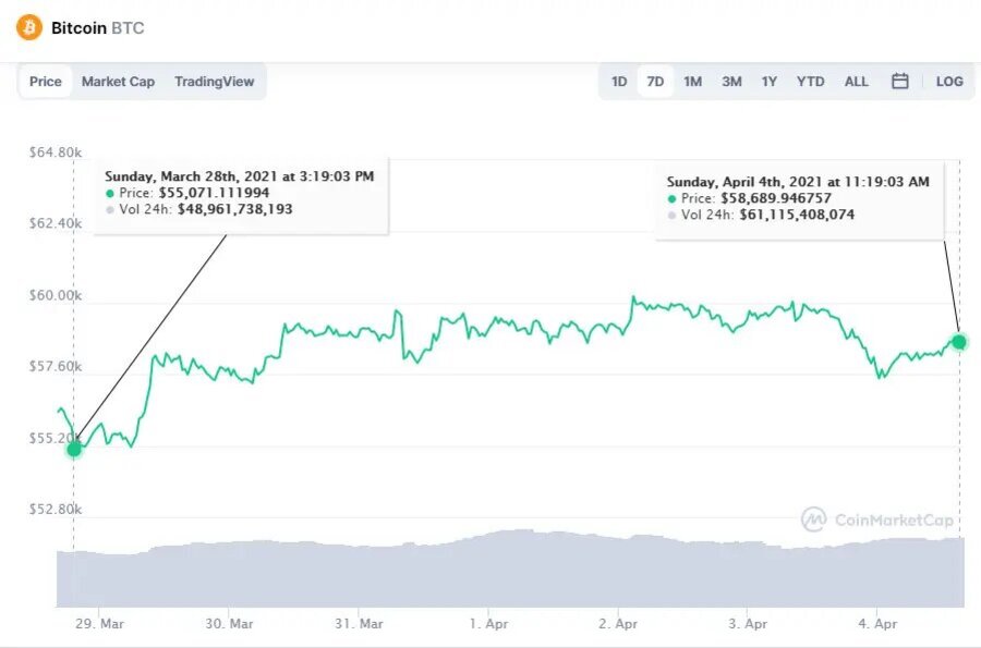 Bitcoin registró el pasado domingo 4 de abril un 6,7% de auge en los últimos 7 días, en medio de un impulso atribuido al respaldo de instituciones financieras, como Visa. El lunes 29, el precio de BTC repuntó 3%, para acercarse de nuevo a los USD 60.000 y lograr la mejor apreciación histórica de un mes de marzo, desde 2013.