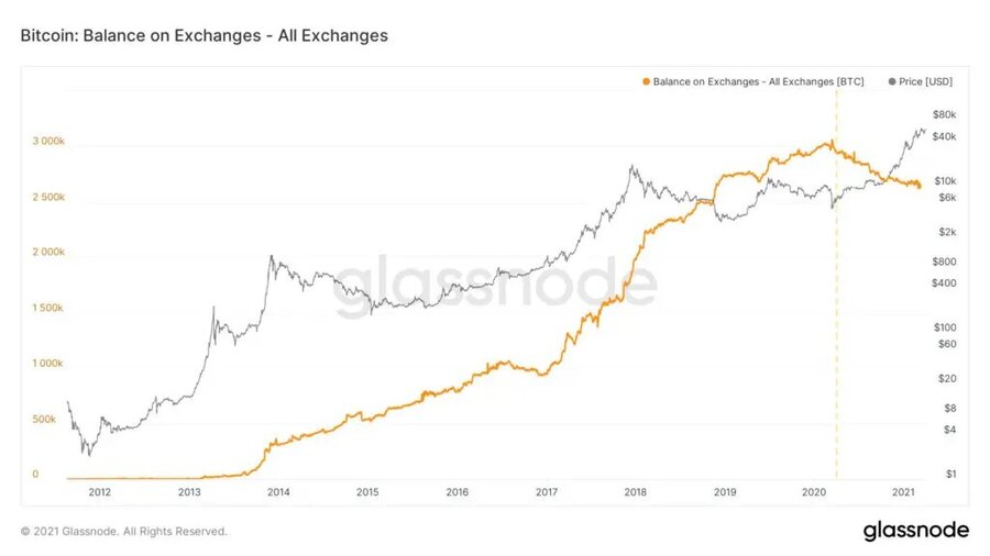 Como señal que favorece el impulso alcista del precio de bitcoin, un informe de Glassnode, comentado el pasado miércoles 31 por este medio, afirma que los inventarios de BTC en los exchanges han continuado cayendo y ya han declinado 20% en lo que va de año.