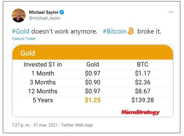 En los últimos 30 días el entusiasta del oro habría perdido 3 céntimos, frente a una ganancia de 17 céntimos para quien invirtió en bitcoin. La desventaja del oro se va ampliando en períodos más largos hasta que en los últimos cinco años, bitcoin ofrece un retorno de USD 139,28 y el oro mantiene la ganancia en el rango de los céntimos. “El oro ya no funciona, Bitcoin lo rompió”, sentencia Saylor al inicio del tuit.