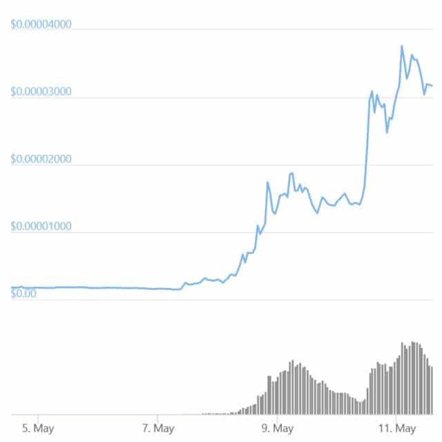 Según CoinGecko, a las 7:43 GMT, el precio de la moneda ha subido un 120% en un día, un 1.944% en una semana y un 39.205% en un mes, cotizando ahora a 0,00003249 dólares. La oferta máxima de tokens es de 1 cuatrillón, mientras que la oferta de circulación y la capitalización de mercado siguen siendo una incógnita. Según CoinMarketCap, su capitalización de mercado es de 11.950 millones de dólares, y ocupa el 18º lugar según esta métrica.