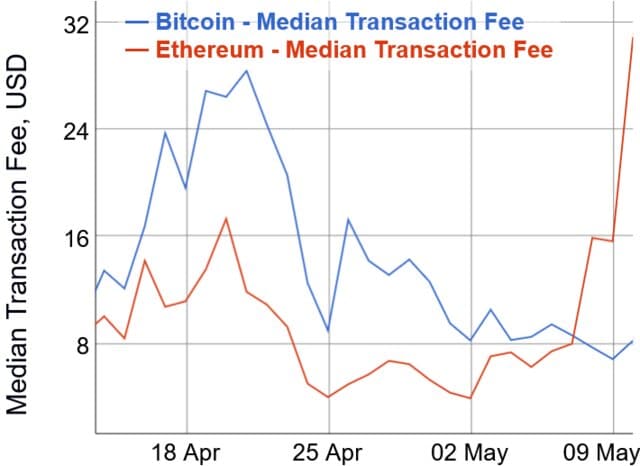 Hablando de la red Ethereum, aunque bajó un poco a principios de mes, la mediana de las tarifas de transacción de Ethereum empezó a subir el 2 de mayo y luego se disparó el 7 de mayo, experimentando en total un aumento del 684% en cuestión de ocho días. El 10 de mayo, la cifra se situaba en 31 dólares.